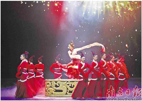 活動現場,別具特色的節目演出展示了廣州文化藝術發展的新風貌,為現場國內外觀眾帶來了古今交融的沉浸式體驗。圖為女子群舞《粵舞新韻》。圖片來源:南方日報