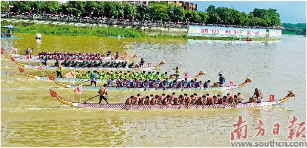 8時許,許多觀眾便早早在漠陽江畔等候。隨著裁判發令槍響,漠陽江賽道上,一條條龍舟猶如一支支離弦之箭競相“發射”,選手們鼓足干勁,意氣風發,飛濺的浪花、飛舞的龍旗、飛馳的龍舟,以及“咚咚”的鼓點聲、吶喊聲,構成了一幅龍舟競渡的民俗風情畫。