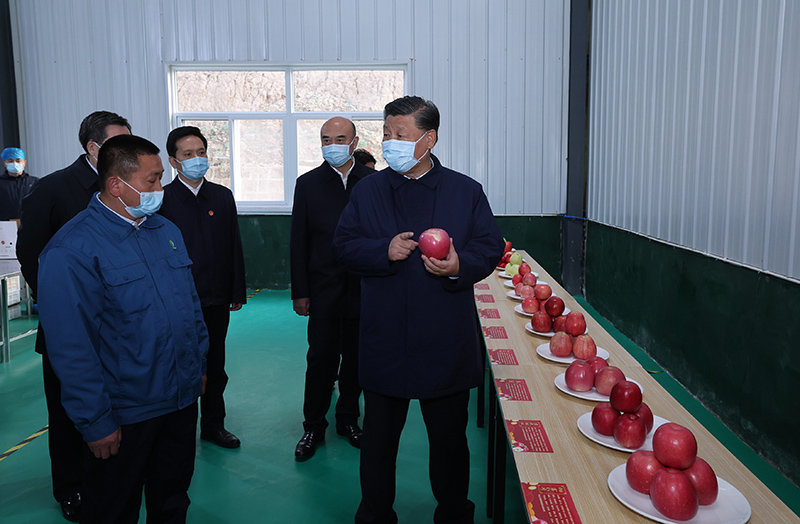 10月26日至28日,中共中央總書記、國家主席、中央軍委主席習(xí)近平在陜西省延安市、河南省安陽市考察。這是26日下午,習(xí)近平在延安市安塞區(qū)高橋鎮(zhèn)南溝村蘋果洗選車間,察看當?shù)胤N植的蘋果。圖片來源:新華網(wǎng)