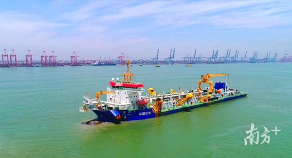世界領先、亞洲最大的中交旗艦挖泥船“浚洋1”在廣州港深水航道拓寬工程施工。圖片來源:南方+客戶端