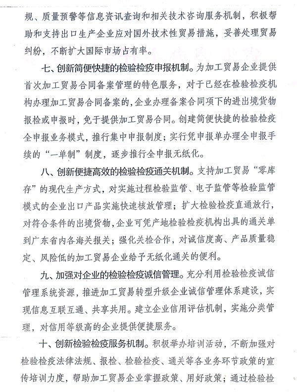 各地級(jí)以上市人民政府,省政府各部門(mén)、各直屬機(jī)構(gòu): 近日,國(guó)家質(zhì)檢總局根據(jù)廣東出入境檢驗(yàn)檢疫局調(diào)研意見(jiàn),出臺(tái)了《國(guó)家質(zhì)檢總局關(guān)于促進(jìn)廣東省加工貿(mào)易轉(zhuǎn)型升級(jí)的檢驗(yàn)檢疫措施的通知》(國(guó)質(zhì)檢通〔2010〕456號(hào)),支持我省建設(shè)全國(guó)加工貿(mào)易轉(zhuǎn)型升級(jí)試驗(yàn)區(qū)。根據(jù)省政府領(lǐng)導(dǎo)意見(jiàn),現(xiàn)將國(guó)質(zhì)檢通〔2010〕456號(hào)文轉(zhuǎn)發(fā)給你們,請(qǐng)認(rèn)真組織學(xué)習(xí)宣傳,配合做好相關(guān)工作。同時(shí),各地、各部門(mén)要借鑒國(guó)家質(zhì)檢總局和廣東出入境檢驗(yàn)檢疫局的做法,積極采取有效措施,為加工貿(mào)易企業(yè)轉(zhuǎn)型升級(jí)提供優(yōu)質(zhì)、高效的服務(wù)。