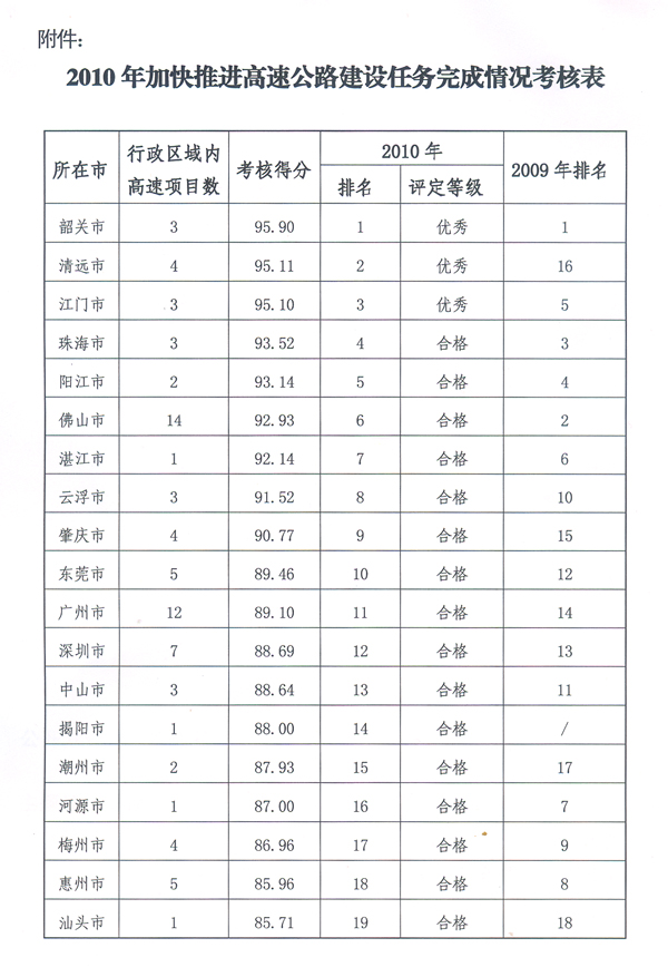 關(guān)于2010年我省高速公路建設(shè) 目標(biāo)任務(wù)完成情況的通報(bào) ? 各地級(jí)以上市人民政府,各縣(市、區(qū))人民政府,省政府各部門、各直屬機(jī)構(gòu): 2010年,各地、各有關(guān)部門和各高速公路項(xiàng)目業(yè)主單位按照省委、省政府決策部署,搶抓機(jī)遇,加快以高速公路為“龍頭”的交通基礎(chǔ)設(shè)施建設(shè),高速公路通車?yán)锍倘〉昧藲v史性的突破,“十一五”規(guī)劃建設(shè)任務(wù)圓滿完成,為應(yīng)對(duì)國(guó)際金融危機(jī)沖擊,保持全省經(jīng)濟(jì)社會(huì)平穩(wěn)較快發(fā)展作出了積極貢獻(xiàn)。有關(guān)情況通報(bào)如下: 一、高速公路項(xiàng)目建設(shè)總體進(jìn)展情況 (一)全年高速公路建設(shè)目標(biāo)順利完成。2010年全省高速公路建設(shè)完成投資493億元,為年度計(jì)劃的103%,同比增長(zhǎng)33.4%。加快推進(jìn)續(xù)建高速公路項(xiàng)目33項(xiàng)(35段)共1974公里,新開工項(xiàng)目11項(xiàng)共535公里,順利建成了二廣高速公路懷集至三水段、韶贛高速公路、湛徐高速公路和陽陽高速公路等14個(gè)項(xiàng)目共800公里,南雄、仁化、始興、雷州、徐聞、廣寧、懷集和陽春等8縣(市)實(shí)現(xiàn)通高速公路目標(biāo),全省通高速公路縣(市)達(dá)54個(gè),通達(dá)率80.6%。重點(diǎn)建設(shè)項(xiàng)目的關(guān)鍵環(huán)節(jié)任務(wù)基本按照《2010年度廣東省加快推進(jìn)高速公路重點(diǎn)建設(shè)項(xiàng)目關(guān)鍵環(huán)節(jié)責(zé)任目標(biāo)分解》(以下稱《責(zé)任表》)的要求完成。全省高速公路通車?yán)锍掏黄?800公里。 (二)項(xiàng)目核準(zhǔn)和用地報(bào)批工作穩(wěn)步推進(jìn)。各地、各有關(guān)部門認(rèn)真落實(shí)“綠色通道”和“并聯(lián)審批”制度,積極與國(guó)家相關(guān)部門匯報(bào)溝通,全力加快項(xiàng)目核準(zhǔn)、用地報(bào)批等工作,用地獲批數(shù)量創(chuàng)歷年之最。截至2010年底,羅陽高速公路、二廣高速公路連州至懷集段、江番高速公路及江珠高速公路北延線、潮惠高速公路等10個(gè)高速公路項(xiàng)目獲得核準(zhǔn);湛徐高速公路、增從高速公路、陽陽高速公路、江肇高速公路、廣樂高速公路韶關(guān)段等16項(xiàng)(19段)共1007公里整體用地獲得批復(fù)。 (三)征地拆遷工作取得較大進(jìn)展。高速公路建設(shè)項(xiàng)目沿線各級(jí)政府切實(shí)承擔(dān)征地拆遷主體責(zé)任,按照《責(zé)任表》時(shí)限要求,加快推進(jìn)征地拆遷工作,對(duì)嚴(yán)重制約高速公路建設(shè)的重點(diǎn)難點(diǎn)問題加強(qiáng)現(xiàn)場(chǎng)督辦,落實(shí)問責(zé)制度。韶關(guān)、清遠(yuǎn)、江門、珠海、陽江、佛山、湛江等地各級(jí)政府及各參建單位上下聯(lián)動(dòng),力促2010年計(jì)劃建成通車項(xiàng)目的征地拆遷工作取得突破性進(jìn)展,為項(xiàng)目如期完工創(chuàng)造了條件。 根據(jù)《廣東省加快重點(diǎn)交通基礎(chǔ)設(shè)施建設(shè)獎(jiǎng)懲激勵(lì)辦法(試行)》規(guī)定,省有關(guān)部門對(duì)2010年全省高速公路建設(shè)目標(biāo)任務(wù)完成情況進(jìn)行了考核,其中韶關(guān)、清遠(yuǎn)和江門3市在落實(shí)高速公路重點(diǎn)項(xiàng)目建設(shè)各項(xiàng)目標(biāo)任務(wù)方面取得了突出成績(jī),被評(píng)定為優(yōu)秀;珠海等16個(gè)地級(jí)以上市被評(píng)為合格(考核結(jié)果詳見附表,茂名、汕尾兩市行政區(qū)域內(nèi)2010年沒有高速公路建設(shè)項(xiàng)目,不參與該年度考核。)。韶關(guān)市連續(xù)兩年被評(píng)定為優(yōu)秀,予以通報(bào)表?yè)P(yáng)。 二、當(dāng)前影響加快推進(jìn)高速公路建設(shè)的主要問題 (一)部分路段征地拆遷工作未按《責(zé)任表》限定時(shí)間完成。具體為:博深高速公路惠州段、東莞段和深圳段,廣珠西線高速公路三期中山段,廣河高速公路廣州段,廣州增從高速公路,汕揭高速公路汕頭段,梅大高速公路梅縣段。 (二)部分項(xiàng)目整體用地材料審批難。一是審批周期長(zhǎng),個(gè)別項(xiàng)目整體用地材料報(bào)至國(guó)土資源部已超過1年仍未得到批復(fù);二是受新增建設(shè)用地土地有償使用費(fèi)繳納問題影響,部分項(xiàng)目整體用地材料已通過國(guó)務(wù)院審批,但因所在地政府尚未繳納新增建設(shè)用地土地有償使用費(fèi),將可能被國(guó)土資源部作退件處理,如佛開高速公路擴(kuò)建工程江門段、太澳高速公路佛山順德至中山段(廣珠西線高速公路二期)、廣州繞城公路南段廣州段和佛山段等。 (三)部分項(xiàng)目跨越鐵路工程手續(xù)辦理難。受鐵路持續(xù)運(yùn)營(yíng)要求和運(yùn)營(yíng)安全等問題影響,目前我省在建高速公路涉及跨越鐵路工程審批手續(xù)辦理周期長(zhǎng)、辦理難度大,制約了部分路段建設(shè),如肇花高速公路下穿武廣鐵路、廣樂高速公路上跨京廣鐵路等。 三、下一步工作要求 為實(shí)現(xiàn)本屆政府任期內(nèi)高速公路通車?yán)锍?500公里和“十二五”縣縣通高速公路目標(biāo),2011年全省高速公路要續(xù)建里程1732公里、計(jì)劃新開工里程超過700公里、力爭(zhēng)建成里程200公里,任務(wù)仍十分艱巨。各地、各有關(guān)部門要進(jìn)一步統(tǒng)一思想,振奮精神,乘勢(