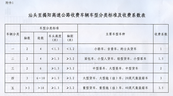省交通運輸廳、物價局: 粵交費〔2011〕1351號請示收悉。省人民政府同意汕頭至揭陽高速公路外砂至庵埠段交工驗收通車和收費站收費設施經驗收符合省聯網收費技術要求后開始收費,汕頭至揭陽高速公路全線收費車型按全省高速公路統一標準,即按車輛軸(輪)數及車頭高度等物理參數進行分類,一至五類車的收費系數分別為1、15、2、3、35;月浦至揭東段收費標準為0.45元/標準車公里,外砂至月浦段、揭東至新亨段收費標準為0.6元/標準車公里。 ? 附件:1.汕頭至揭陽高速公路收費車輛車型分類標準及收費系數表 2.汕頭至揭陽高速公路車輛通行費收費標準表 ? 廣東省人民政府辦公廳 二○一一年十二月九日 ?