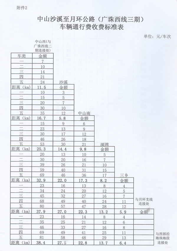 ? 廣東省人民政府辦公廳關(guān)于中山沙溪至月環(huán) 公路車輛通行費有關(guān)問題的復(fù)函 ? 省交通運輸廳、物價局: 粵交費〔2012〕1332號請示收悉。省人民政府同意中山沙溪至月環(huán)公路(廣珠西線三期)交工驗收通車和收費站收費設(shè)施經(jīng)驗收符合省聯(lián)網(wǎng)收費技術(shù)要求后開始收費,收費車型按全省高速公路統(tǒng)一標(biāo)準(zhǔn),即按車輛軸(輪)數(shù)及車頭高度等物理參數(shù)進(jìn)行分類,一至五類車的收費系數(shù)分別為1、1.5、2、3、3.5;收費標(biāo)準(zhǔn)按雙向6 車道以上0.6元/標(biāo)準(zhǔn)車公里執(zhí)行。 ? ? 附件:1.中山沙溪至月環(huán)公路(廣珠西線三期)收費車輛車型分類標(biāo)準(zhǔn)及收費系數(shù)表 2.中山沙溪至月環(huán)公路(廣珠西線三期)車輛通行費收費標(biāo)準(zhǔn)表 ? ? ? 省府辦公廳 2012年12月20日 ? ? ?