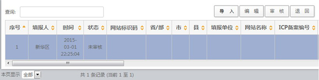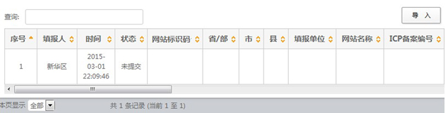 (三)逐級審核。 組織單位在收到上報文件后,使用賬號和密碼登錄報送系統(tǒng),在“政府網(wǎng)站和欄目(系統(tǒng))基本信息表”的數(shù)據(jù)管理頁面中,將上報文件導入系統(tǒng)。
