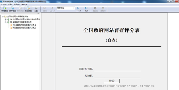 三、檢查整改階段使用說明 (一)填報單位自查。 填報單位打開客戶端軟件,選取“全國政府網(wǎng)站普查評分表”并新建數(shù)據(jù),首先輸入“網(wǎng)站標識碼”和“校驗碼”,通過驗證后,填寫該網(wǎng)站的自查評分信息并保存。