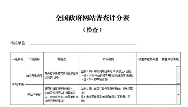 3.網(wǎng)站存在反動、暴力、色情等內(nèi)容。 | 網(wǎng)站出現(xiàn)嚴重錯別字(例如,將黨和國家領導人姓名寫錯)、虛假或偽造內(nèi)容(例如,嚴重不符合實際情況的文字、圖片、視頻)以及反動、暴力、色情等內(nèi)容的,即單項否決。 | | — | | 互動回應差 | 互動回應類欄目長期未回應的情況。 | 監(jiān)測時間點前1年內(nèi),要求對公眾信件、留言及時答復處理的政務咨詢類欄目(在線訪談、調(diào)查征集、舉報投訴類欄目除外)中存在超過三個月未回應的現(xiàn)象,即單項否決。 | | — | 注:如果網(wǎng)站出現(xiàn)“單項否決”指標中的任意一種情形,則判定為不合格網(wǎng)站,不再對以下指標進行評分。如果網(wǎng)站未存在“單項否決”指標所描述的問題,則對以下指標進行評分,各指標累計扣分超過40分的,則同樣判定為不合格網(wǎng)站。不合格網(wǎng)站應立即關停整改。 | | 網(wǎng)站可用性 | 首頁可用性 | 首頁打不開的次數(shù)占全部監(jiān)測次數(shù)的比例。 | 監(jiān)測1周,每天間隔性訪問20次以上,累計超過(含)15秒網(wǎng)站仍打不開的次數(shù)比例每1%扣5分(累計超過(含)5%的,直接列入單項否決)。 | | | | 鏈接可用性 | 首頁及其他頁面不能正常訪問的鏈接數(shù)量。 | 1.首頁上的鏈接(包括圖片、附件、外部鏈接等),每發(fā)現(xiàn)一個打不開或錯誤的,扣1分;如首頁僅為網(wǎng)站欄目導航入口,則檢查所有二級頁面上的鏈接。