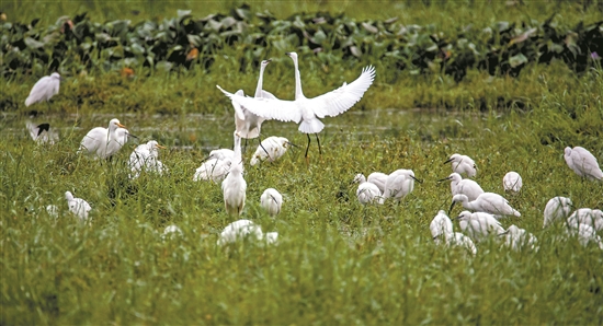 微風襲來,鳥雀聲起,漫步的白鷺驚起,展翅高飛。緊接著一群白鷺出現,在空中形成一朵潔白的云,掠過水面,散開來,落在樹枝上、草地上,草木好似長出了一朵朵潔白的花。