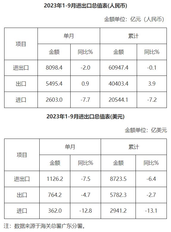 廣東省外貿(mào)進(jìn)出口總值表(2023年1-9月)