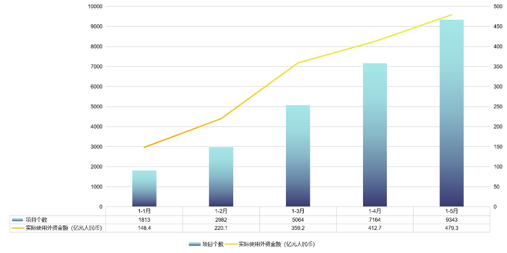 2024年1-5月,全省新設外商直接投資企業9343個,同比增長20.8%;實際使用外資金額479.3億元,同比下降34.1%。