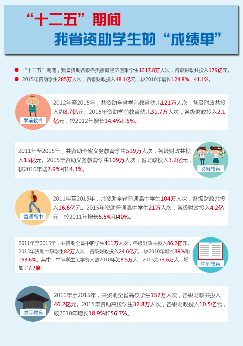 省教育廳有關負責人介紹,“十二五”時期,我省學生資助工作推進力度最大,取得長足發展,各級各類教育資助資金總投入達179億元(不含深圳),受助學生達1317.8萬人,有效解決了困難家庭子女上學難的問題。接下來,將以精準助學為主線,以立德樹人為統領,不斷提高學生資助水平,助力全面建成小康社會。