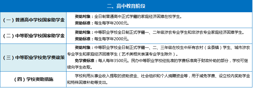 各地各學校也根據實際情況,制定了本地本校的學生資助政策,具體內容可向當地教育部門和學校咨詢。